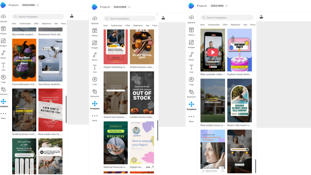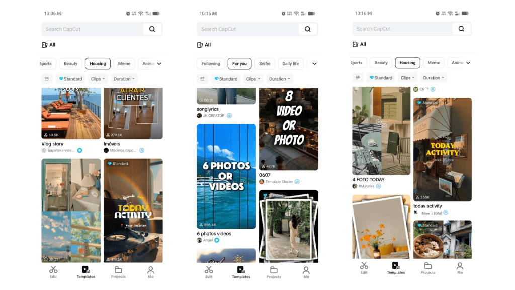 Invideo shines here. Tons of industry-specific templates, built-in voiceovers, and stock libraries. CapCut offers good effect presets but fewer complete templates.