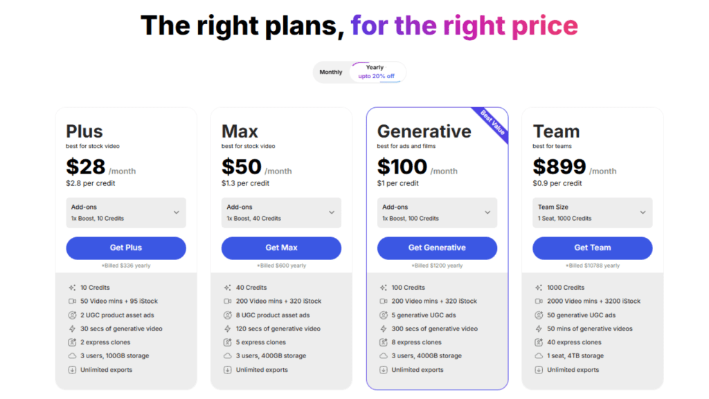 - Generative Plan ($100/month, 20% off yearly) – Built for ad creators and filmmakers needing serious AI power. Includes 100 credits, extended generative video time, and advanced UGC ad tools.